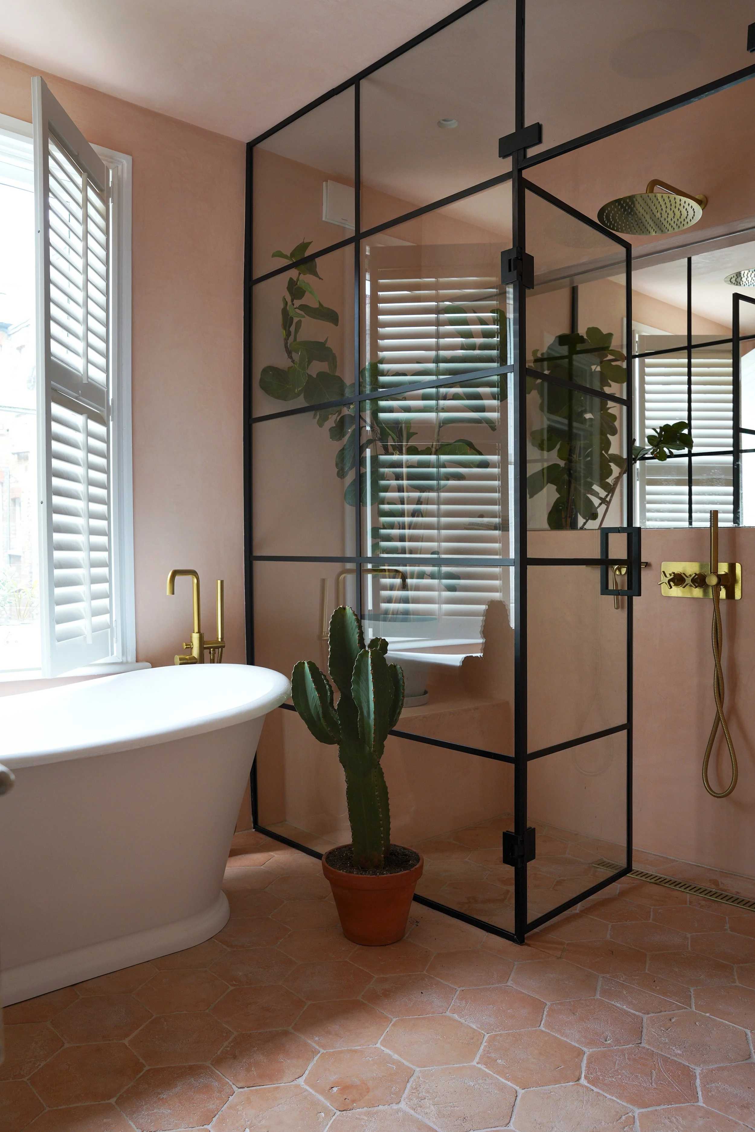 The master bedroom at the front of the house combines reclaimed solid oak floors with restored period details. A former bedroom was converted into a spacious walk-in wardrobe, accessible via steel-framed doors. Elsewhere, the first-floor layout was enhanced with phase two interventions, including the main bathroom, which features Moroccan lime plaster walls, terra cotta floors, a bespoke onyx vanity with hand-welded brass stand, freestanding bathtub, and a full-length mirrored shower niche.The master bedroom at the front of the house combines reclaimed solid oak floors with restored period details. A former bedroom was converted into a spacious walk-in wardrobe, accessible via steel-framed doors. Elsewhere, the first-floor layout was enhanced with phase two interventions, including the main bathroom, which features Moroccan lime plaster walls, terra cotta floors, a bespoke onyx vanity with hand-welded brass stand, freestanding bathtub, and a full-length mirrored shower niche.