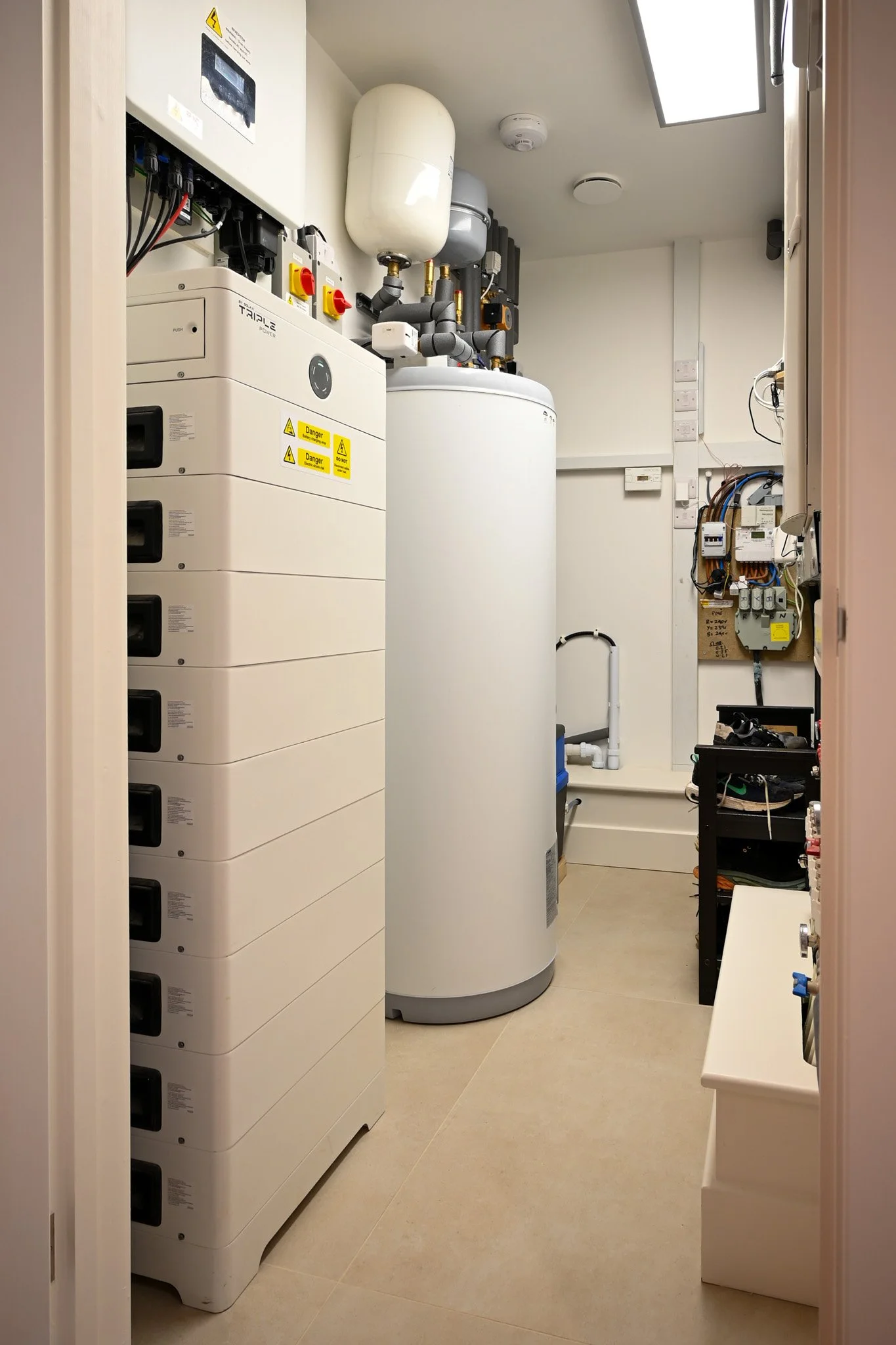 The plant room houses the technology that powers the property, including a 33 kW battery system and 24 solar panels. These components store and generate energy, reducing reliance on external electricity sources.