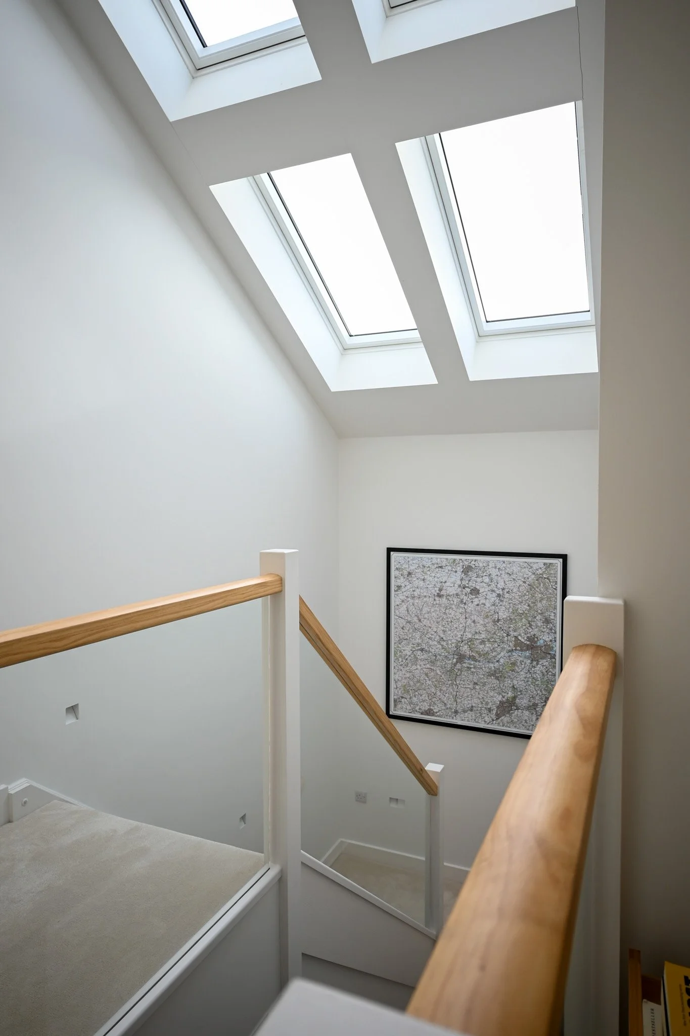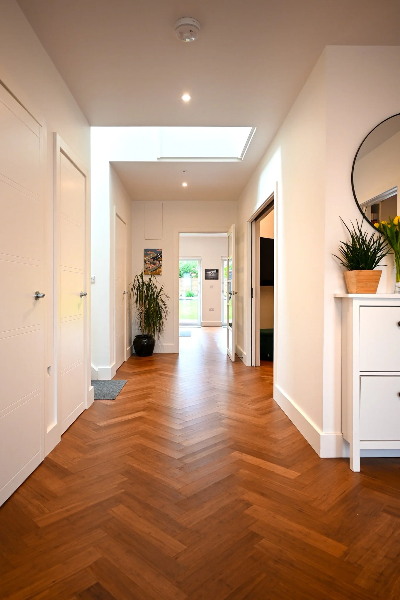 The hallway was designed as a generous, welcoming space suitable for family life and visitors. Rooflights and a lightwell enhance natural illumination, creating an airy atmosphere despite the home’s deep floor plan.