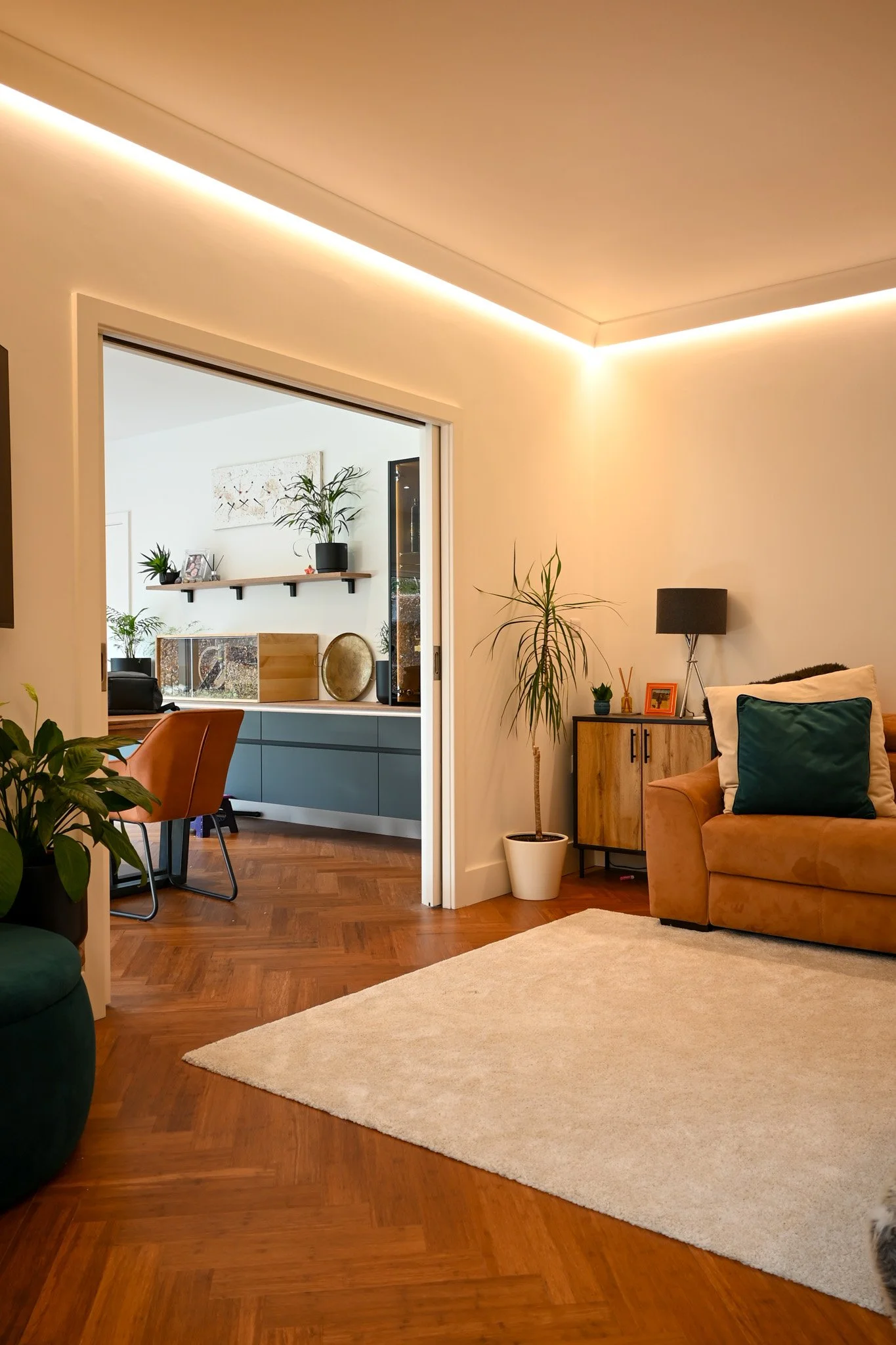 Located in the middle of the property, the sitting room presented a design challenge due to limited natural light. To address this, LED strip lighting was installed beneath the cornice, creating a soft illumination that mimics daylight.