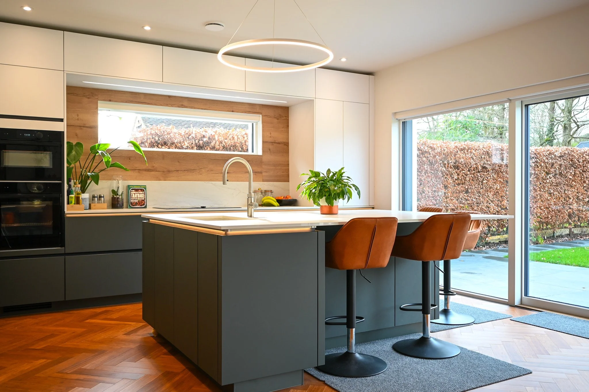 The kitchen features energy-efficient sliding doors that connect the interior to the garden. A carbon-neutral worktop material known as Dekton was selected for its durability and environmental performance.