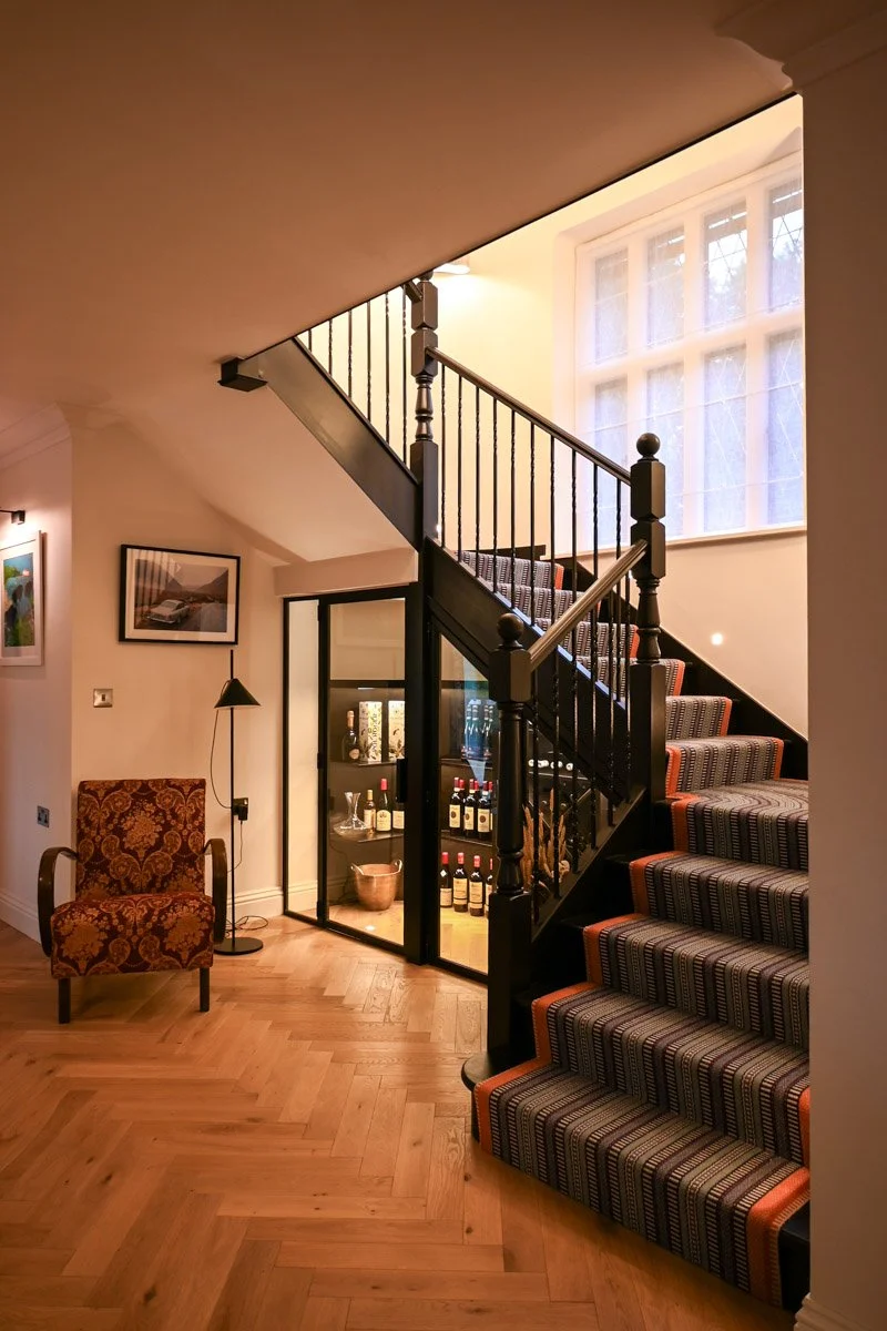 In the entrance hall, it perfectly demonstrated the structural transformation and the methodical design philosophy behind the project. The hall had been constrained by years of alterations: “This was a very dark space. The ceiling was all chopped up and had different beams running through it.” To recover grandeur and light, the ceilings were levelled and raised, walls were rationalized, and new crittall-style glazed doors introduced sightlines and brightness. Claudia explains, “We created one big open entrance hall and… increased the ceiling height, and that made a big difference.” Even the staircase was opened up to introduce transparency: “The staircase was previously a solid banister… hardly any light coming into this space. So we completely stripped this back.” The result is an arrival space that feels contemporary, elegant and cohesive.