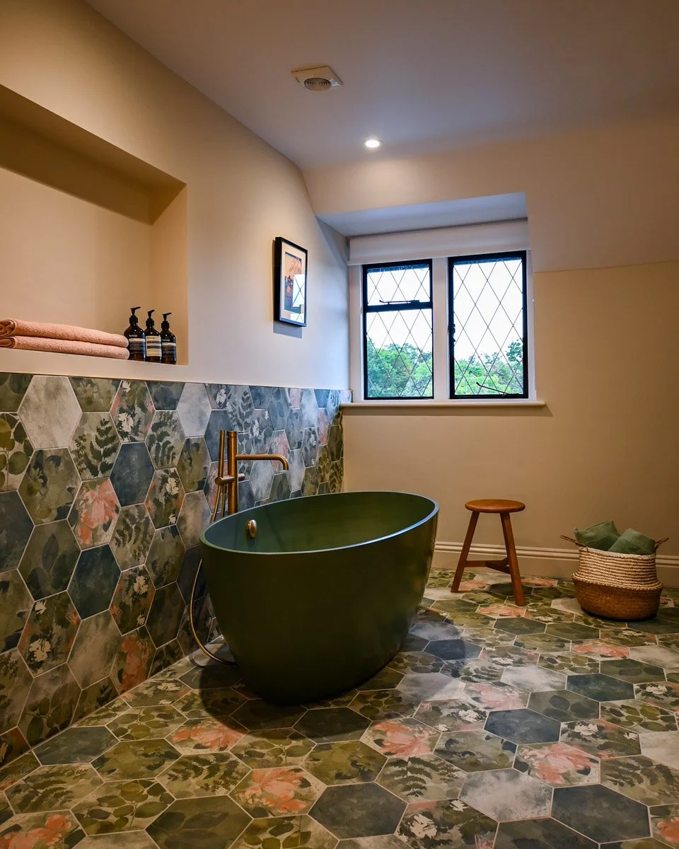 Across the house, seven bathrooms were designed in total, allowing Claudia’s team to explore different moods and combinations. In a modestly playful aside she notes that one in particular “really takes the top in terms of fun tiles,” featuring hexagonal patterns, greens, florals and even a matching green bathtub and joinery.