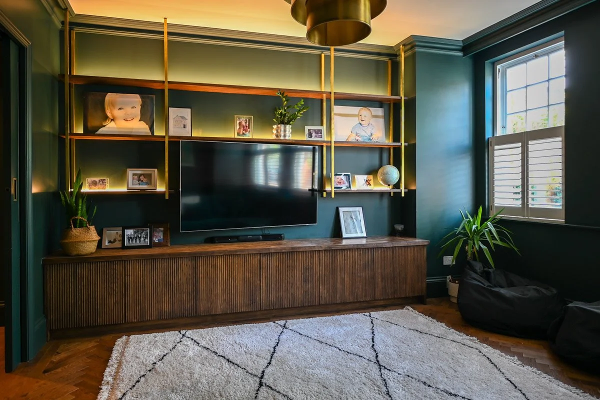 At the front of the house sit two reception rooms, each with a different purpose. One functions as a relaxed family space for the children, complete with built-in storage and hidden gaming zones. The other serves as a more formal living room.