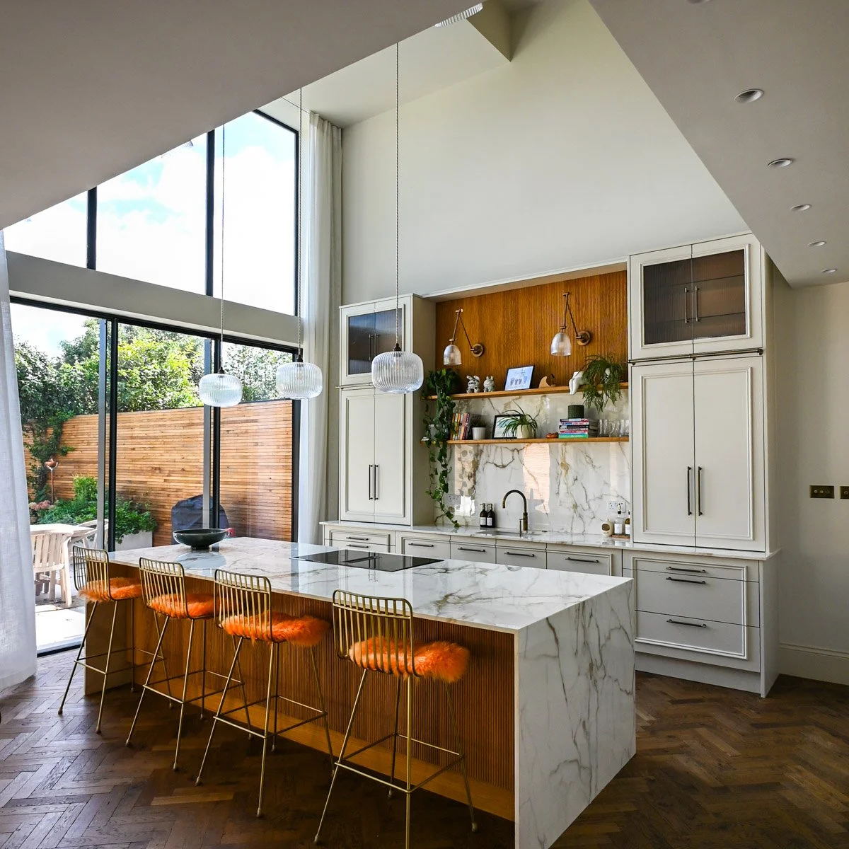At the rear, the house opens into a dramatic double-height kitchen extension that forms the social core of the home. Flooded with natural light from full-height glazing and symmetrical sliding doors, the space blurs the boundary between indoors and garden.