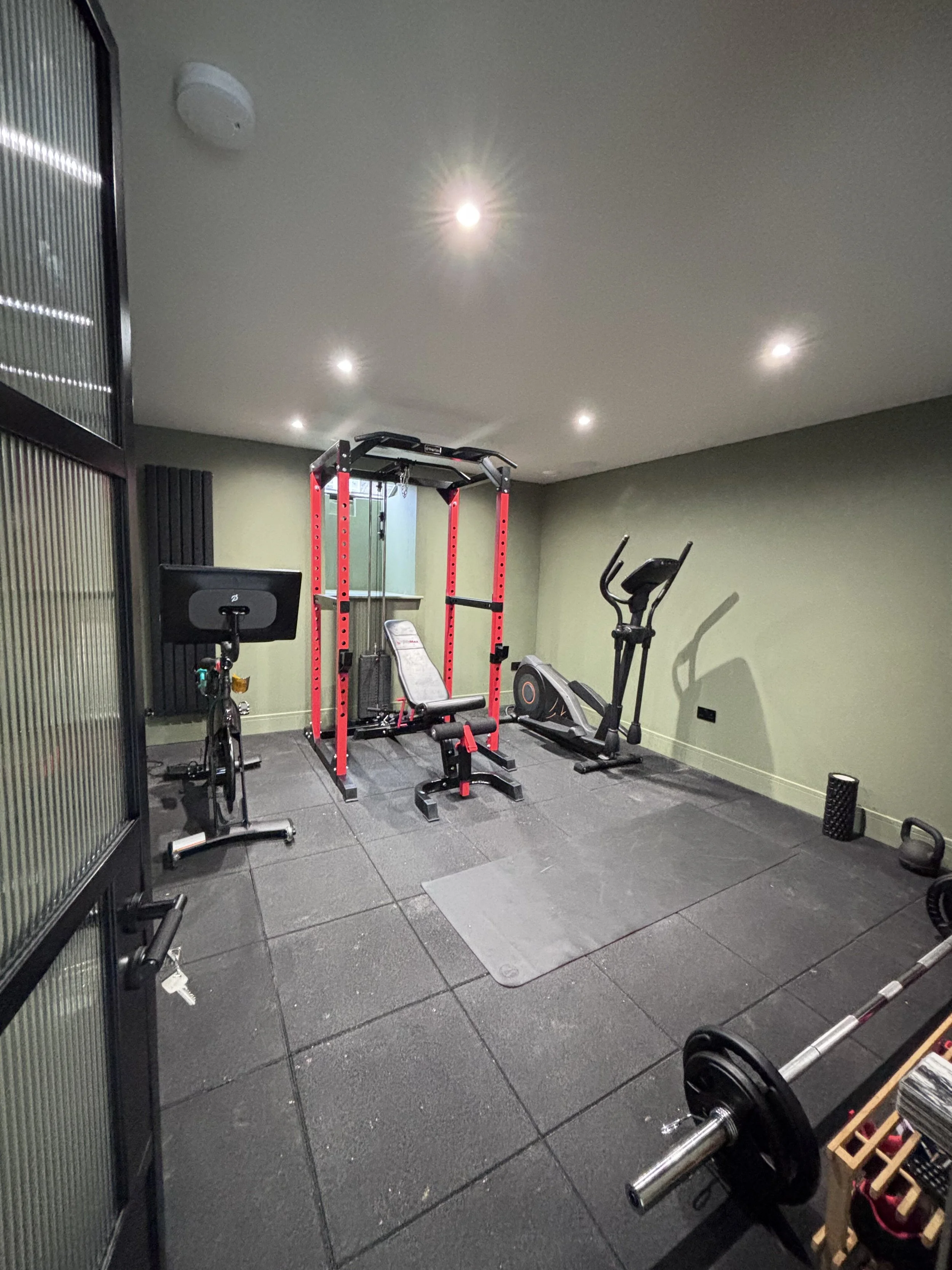 The gym, housed in the original basement footprint with its lowered floor and lightwell, completes the lower ground floor accommodation. Despite its compact footprint, it feels properly usable rather than an afterthought.