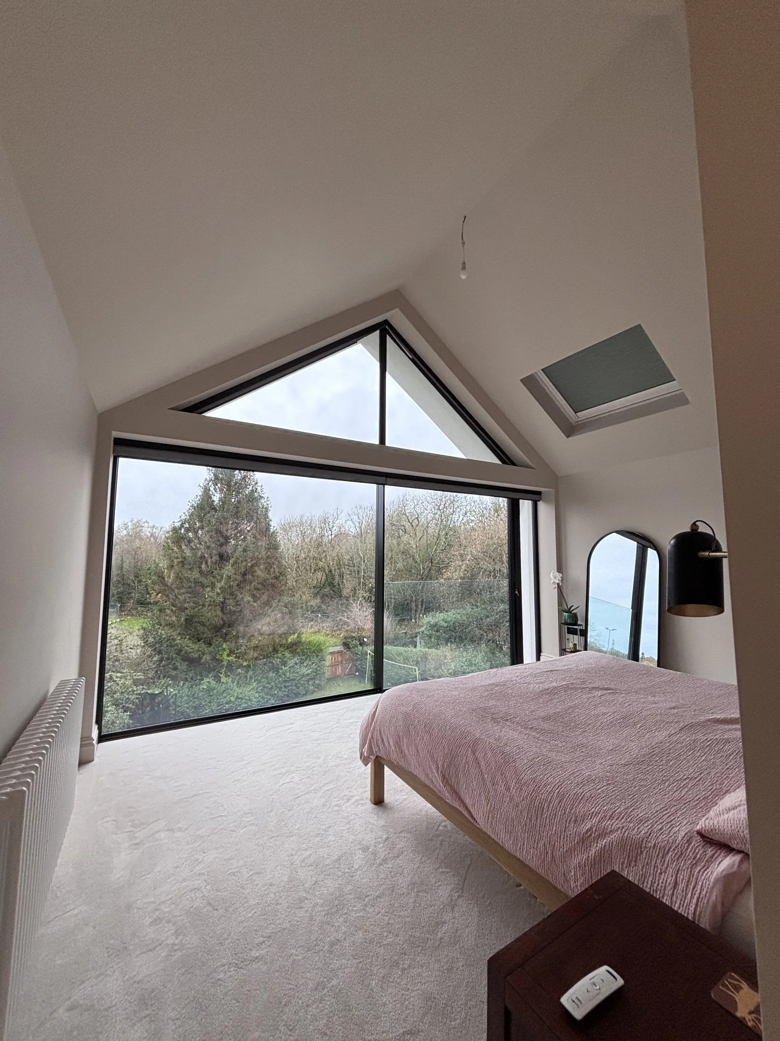 On the first floor, the extension creates a new principal bedroom suite that takes full advantage of the south-facing outlook over woodland. The glazed gable to the rear floods the room with light, while a Juliet balcony opens up the side elevation entirely. Originally, the rear bedroom on this floor was one of the smallest in the house, without any of the views that now define it.
