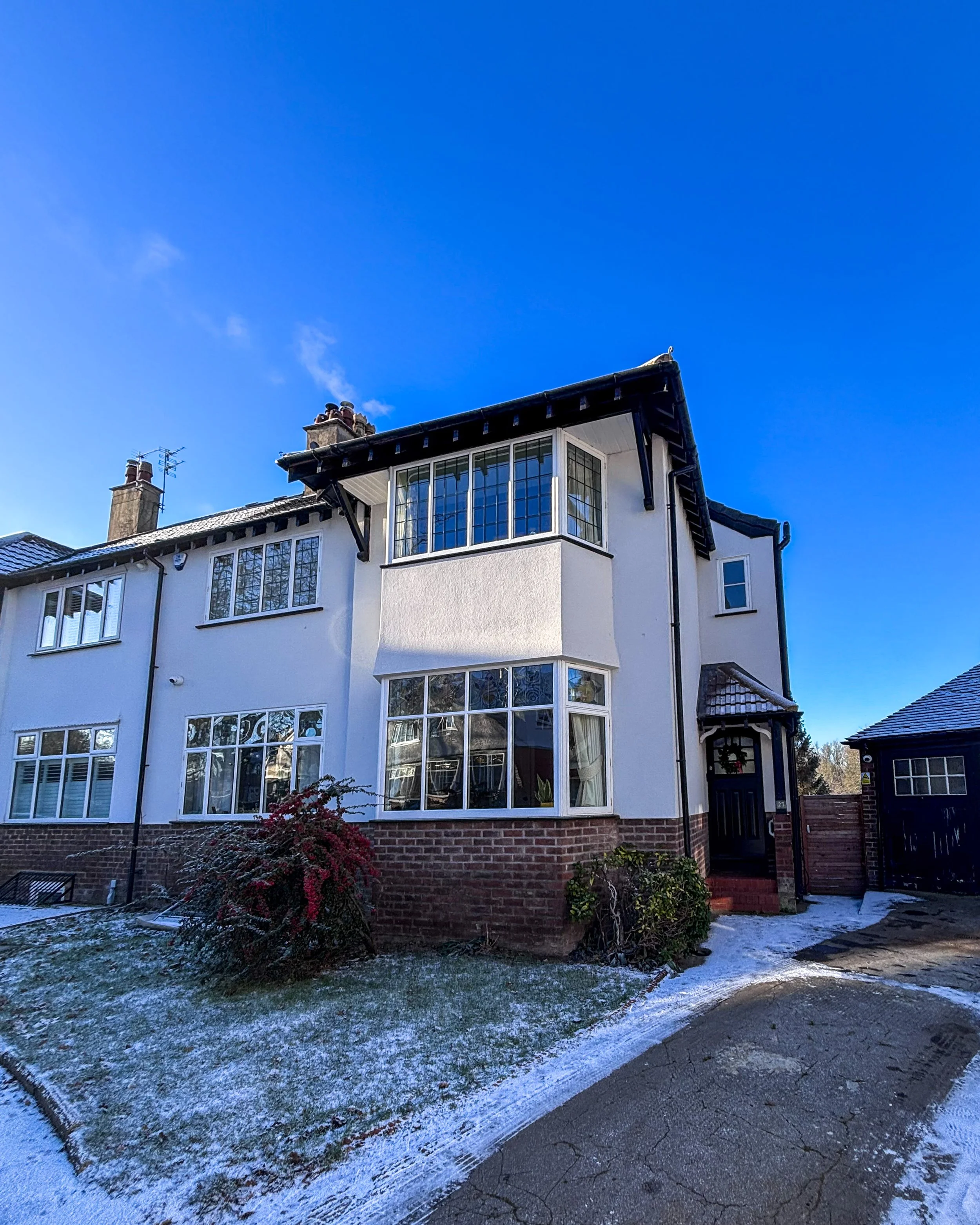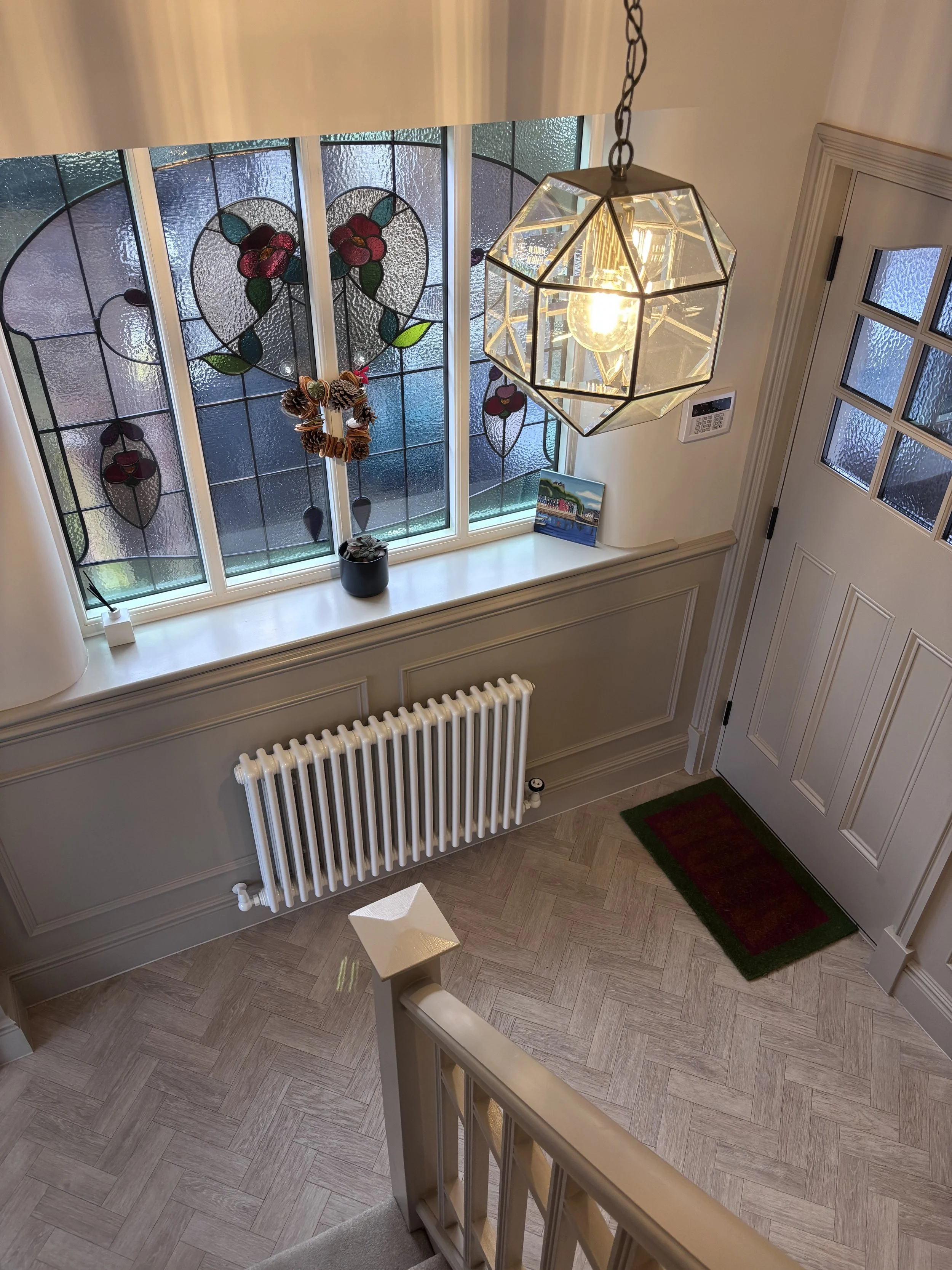 Before any extension work could begin, the existing house required significant restoration. The property had lost many of its period features over the decades, and reinstating them was central to the brief. This included repairing and encapsulating the original stained glass within new triple glazing, reinstating the staircase and spindles that had been lost entirely, restoring the coving and panelling, and applying an insulated render externally to improve the building's thermal performance. Heritage windows with original lead glazing bars were retained on the front elevation, keeping the street presentation authentic to the period.