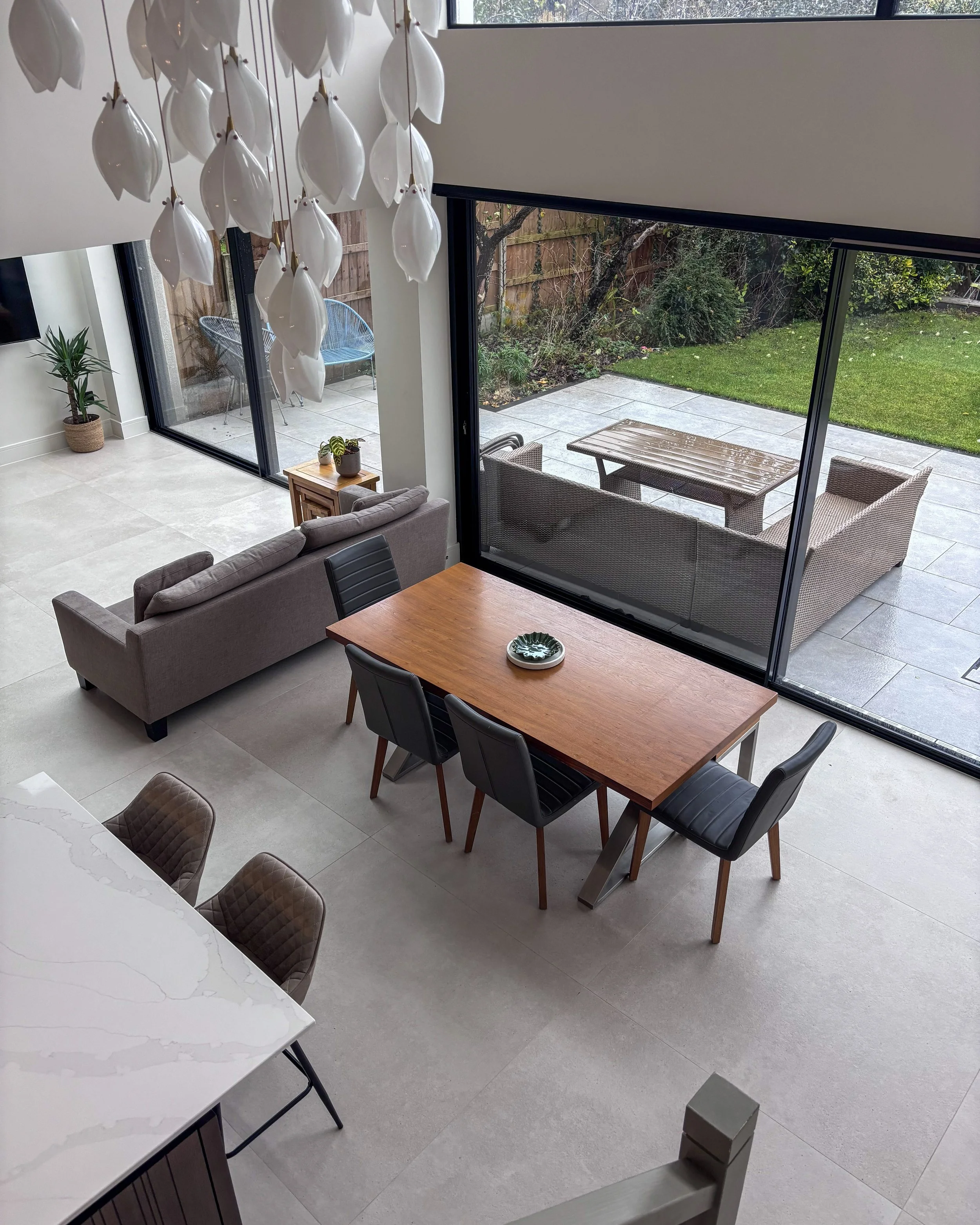 Natural light and a connection to the landscape beyond were central to the design brief. The property sits adjacent to woodland and open fields — a remarkable outlook for a suburban home — and the extension is designed to make the most of it at every level.