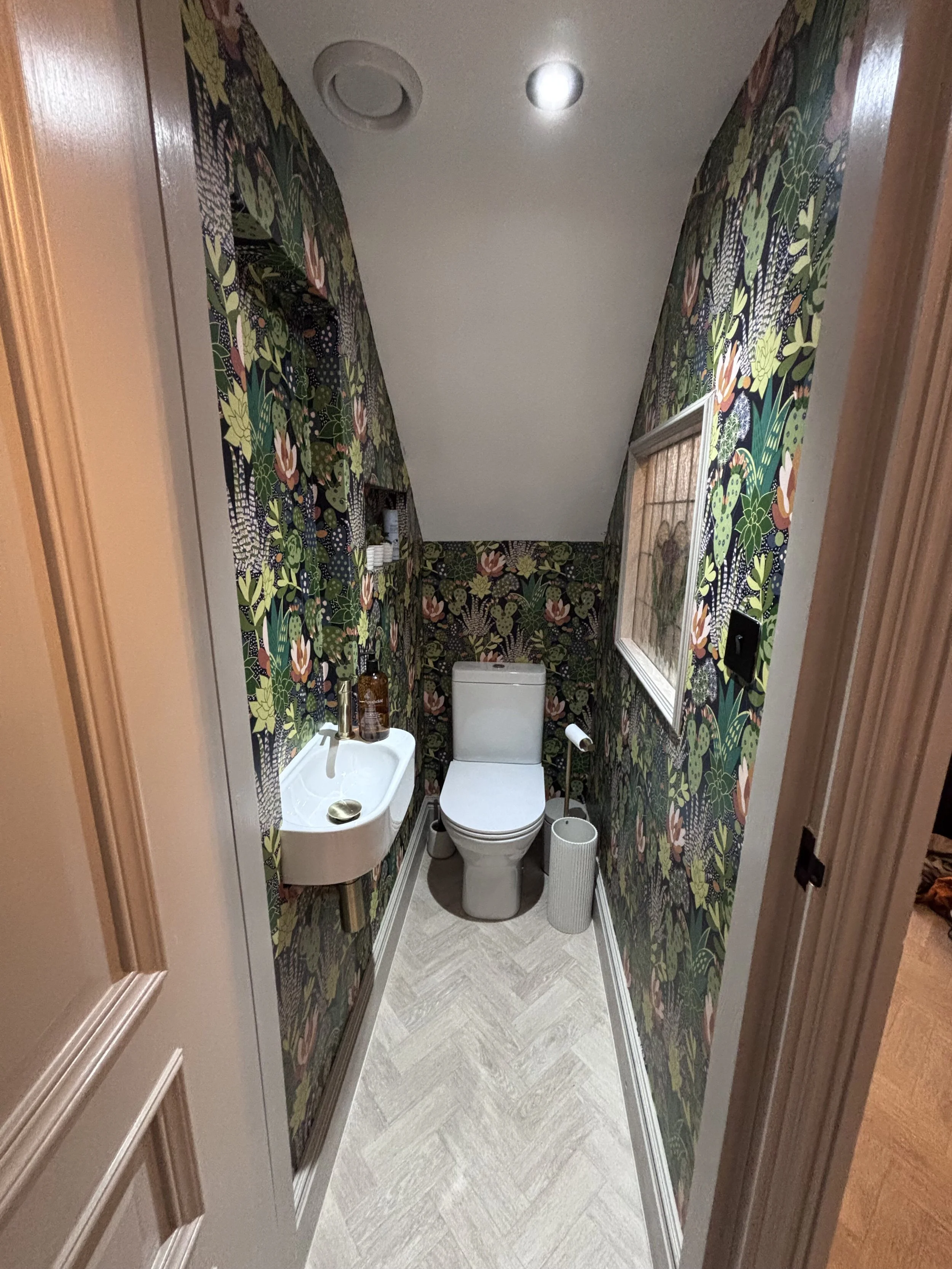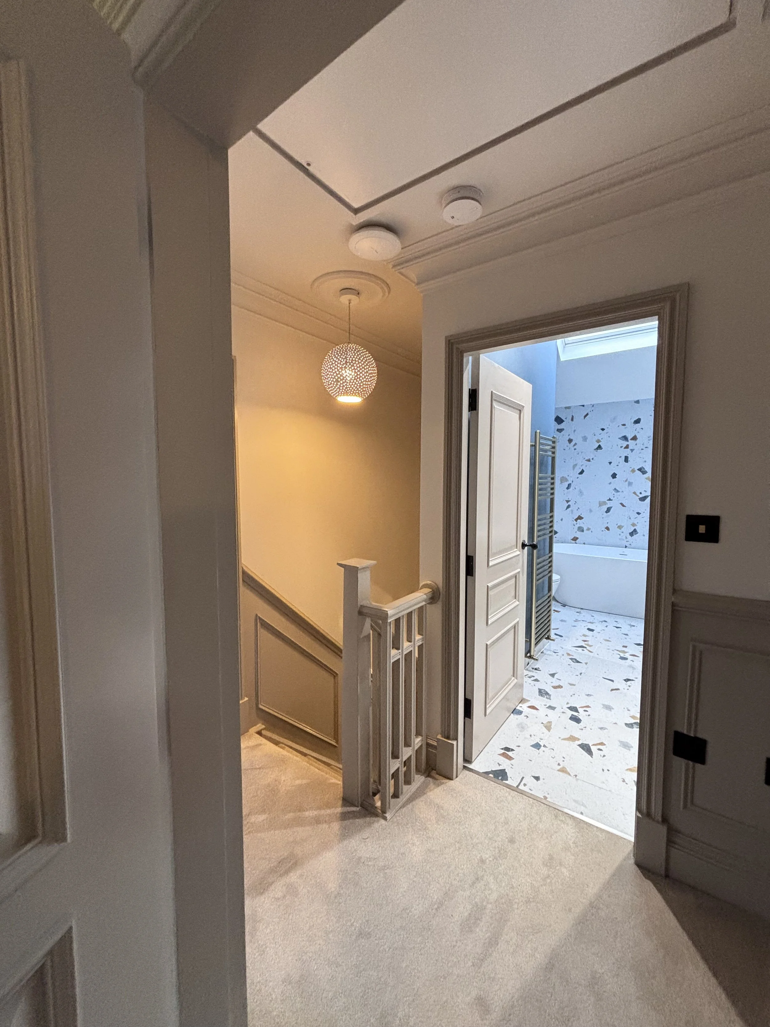 Original stained glass from across the house has been carefully redistributed where practical. In the understairs WC at ground floor level, for example, original stained glass panels have been incorporated into the new window — a small but considered gesture that weaves the building's history into every corner of the renovation.