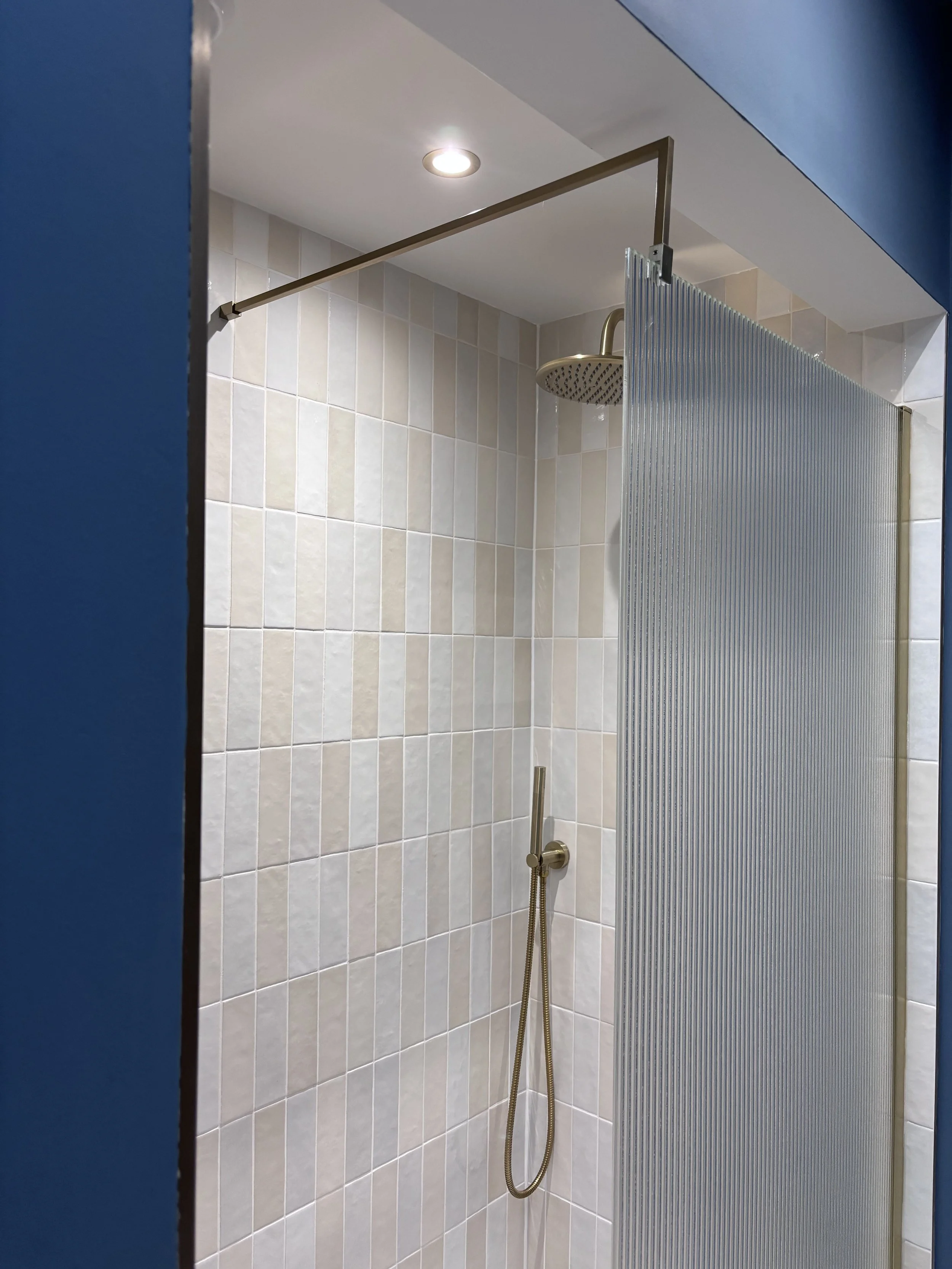 The main family bathroom was formed by combining two separate rooms — a bathroom and a WC — and extending into adjacent hallway space that was better used here. A generous rooflight fills the room with natural daylight, while the most memorable feature is the walk-in shower: carved out of the original chimney void, which was removed internally but preserved above roof level to maintain the Conservation Area streetscape.
