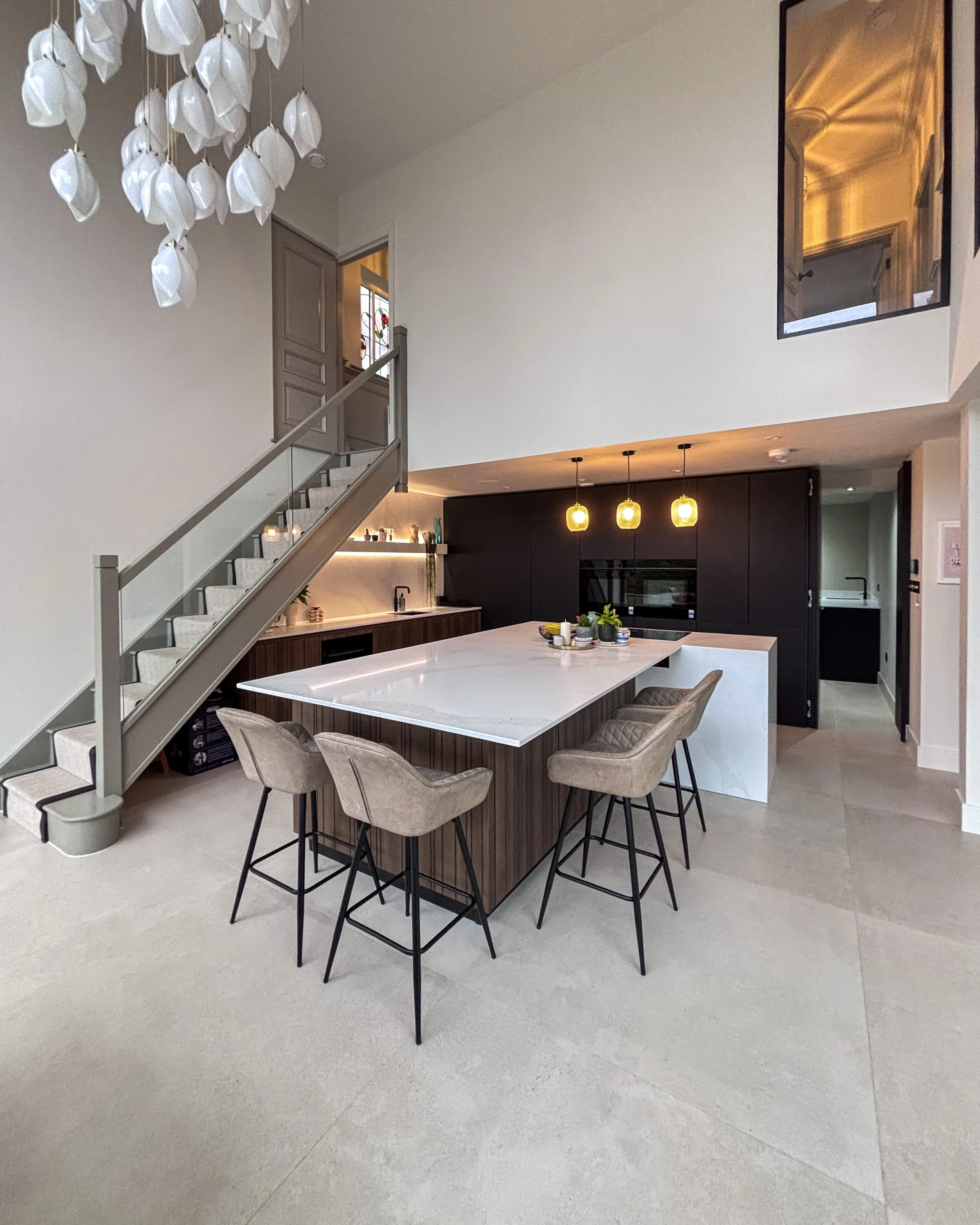 That double-height glazed volume is perhaps the single most dramatic moment in the project. Visible from the front door the moment it opens, it draws the eye instantly from the entrance all the way through to the garden and woodland beyond — an effect Chris was keen to create from the outset.