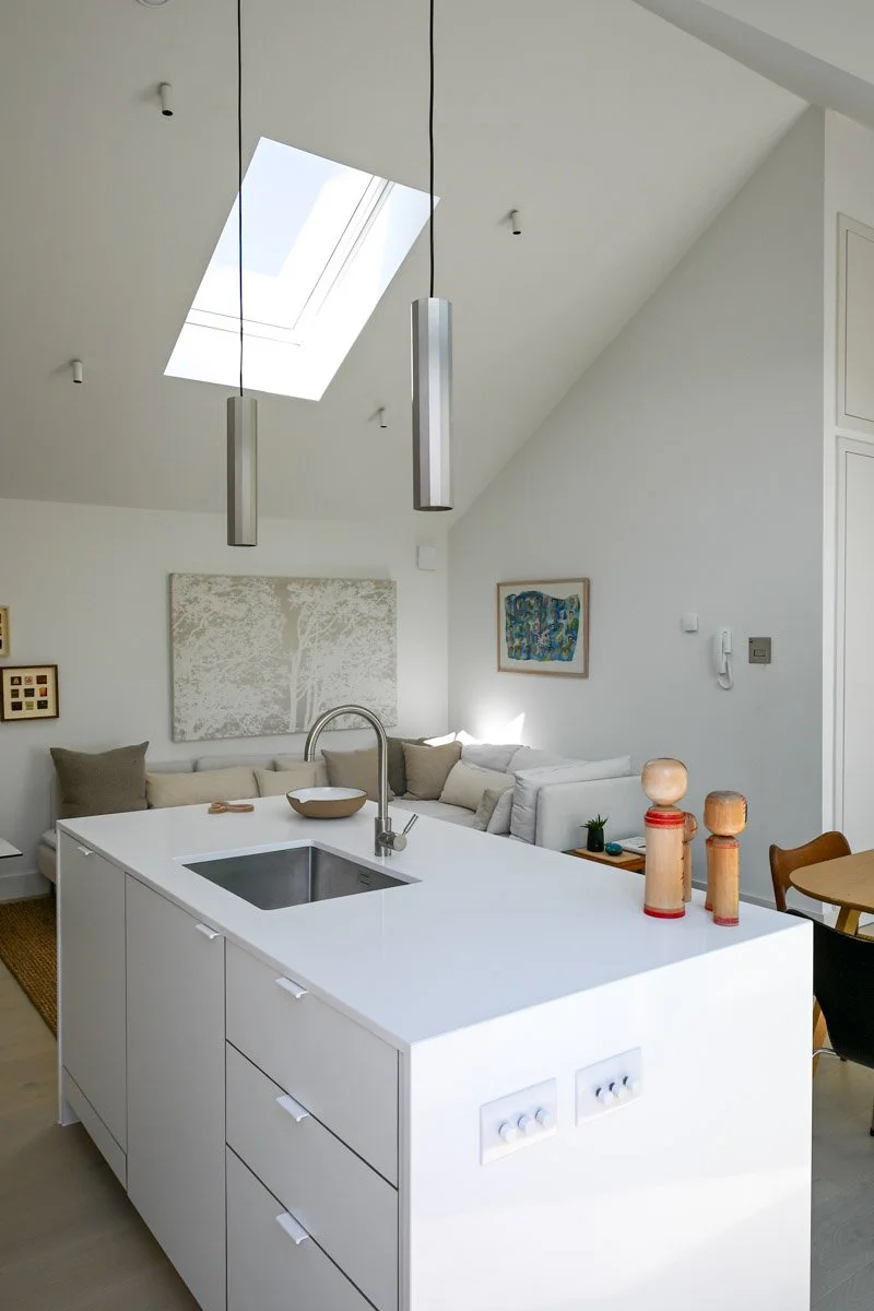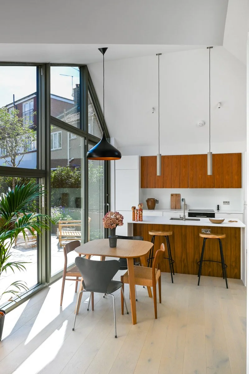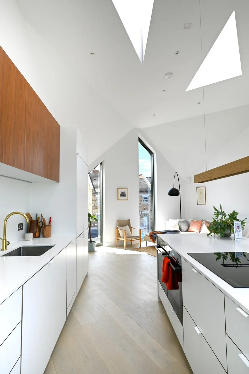 Solar-controlled glazing reduces overheating in summer, while rooflights bring daylight from all directions. “London’s getting warmer and warmer,” Tom notes, “so it was crucial to stop these homes from overheating while keeping the sense of openness.”