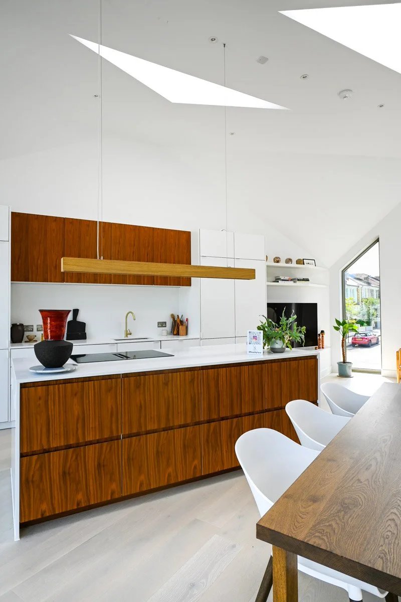 “Lots of developers just think about maximising floor space,” says Tom. “But I’m obsessed with maximising volume.” The vaulted living-dining-kitchen showcases this approach: a dramatic four-metre-high ceiling, triangular rooflights, and complex diamond geometry.
