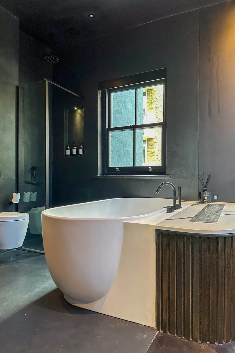 The principle suite continues the home’s dark, dramatic palette with black walls, bespoke wooden panelling, built-in beds with drawers, and integrated storage throughout. Curved walls and skirtings create a sense of flow, while electric blinds, smart lighting, and underfloor heating enhance comfort. The en-suite bathroom contrasts with white fixtures and a freestanding bath, adding a touch of surprise while maintaining cohesion with the home’s design ethos.