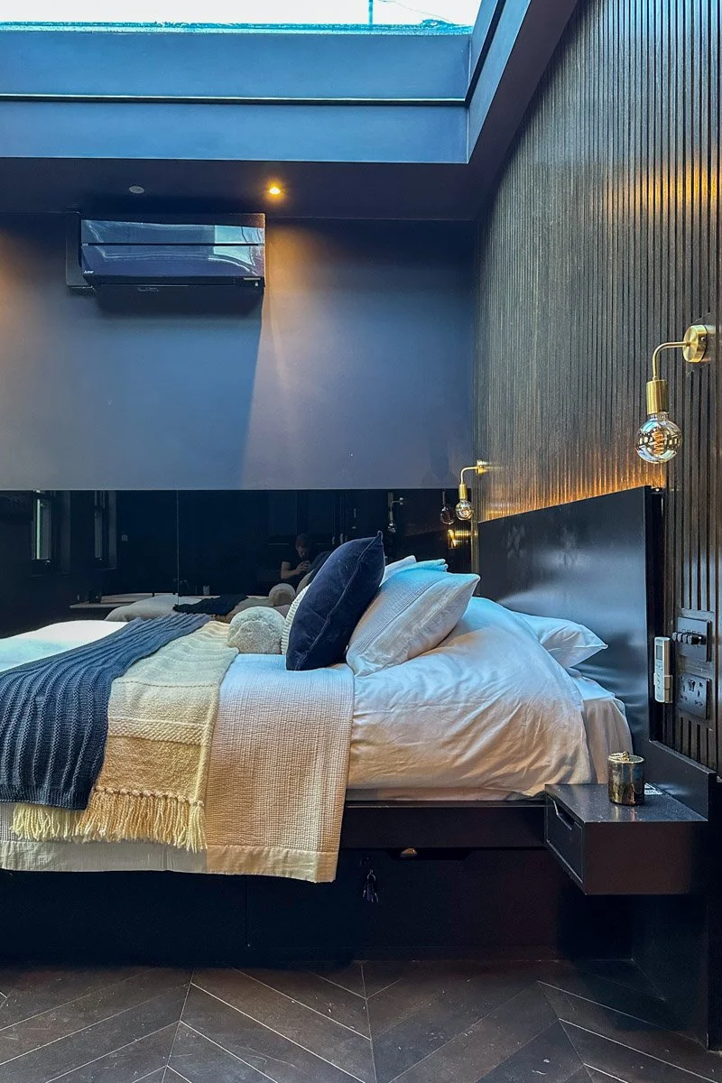 Beneath its striking interiors, the Black Mews is a highly efficient home. A quiet 9 kWh air-source heat pump replaces the original gas system, while high levels of insulation and smart heating keep energy bills remarkably low, around £100–£150 per month. Multiple fireplaces, underfloor heating, and air conditioning ensure the house remains warm in winter and cool in summer.
