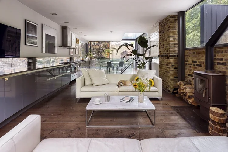 Concrete floors with underfloor heating provide thermal mass and durability, while sections of structural glass flooring allow natural light to filter into the newly excavated basement below.
