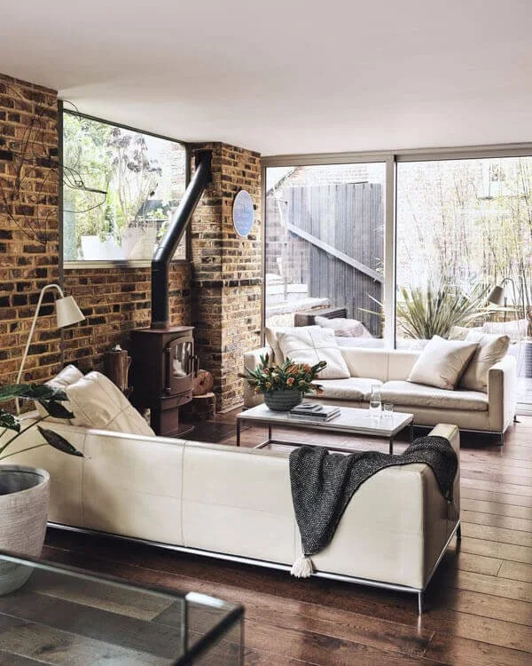 Throughout, smoked oak flooring runs across the upper levels, its dark grain beautifully offsetting the warm brick envelope.