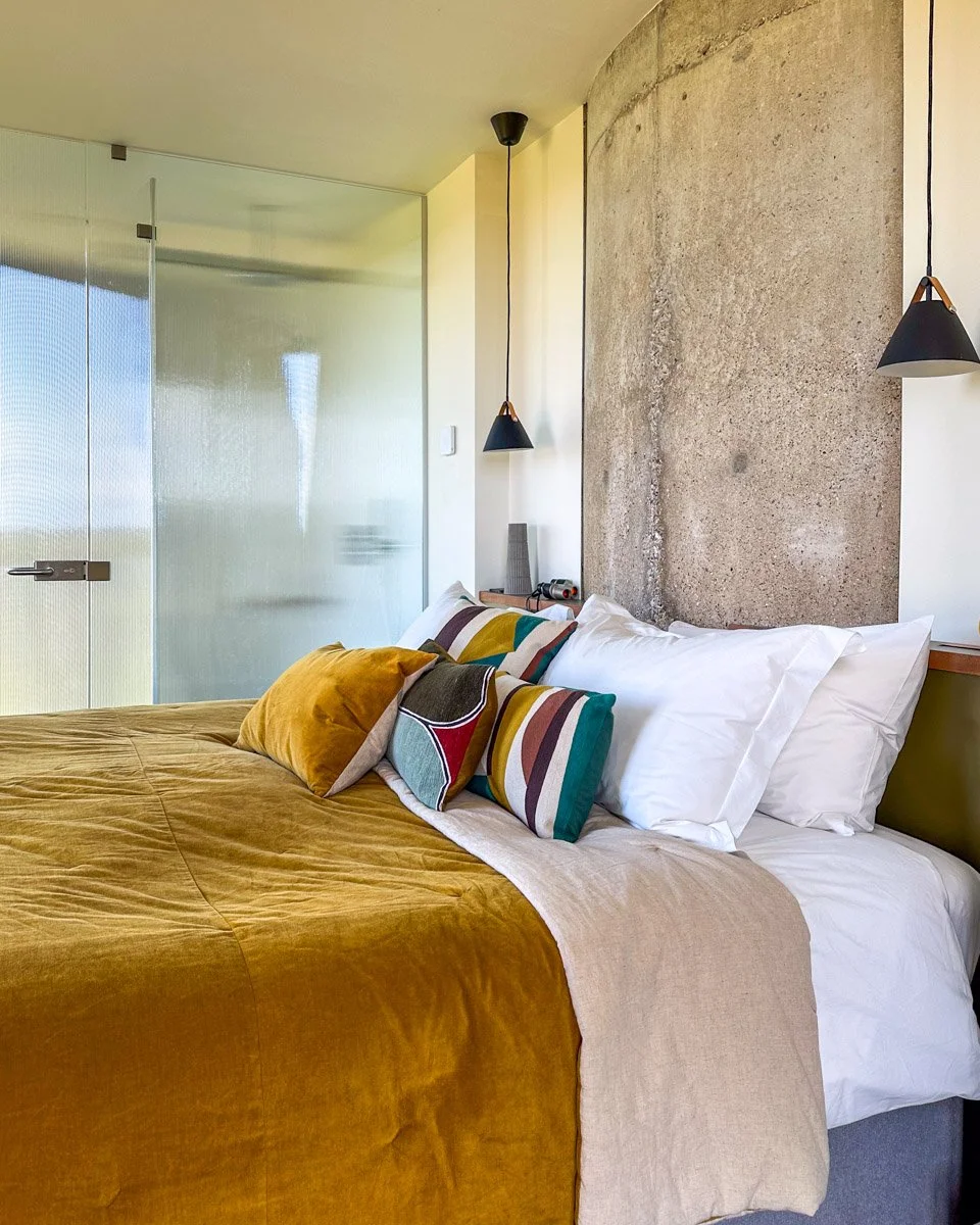 Sections of the central shaft are left exposed within the bedrooms, offering tactile reminders of the building’s industrial past. Elsewhere, the concrete is softened by timber, textiles, and warm colour palettes, striking a careful balance between heritage and comfort.