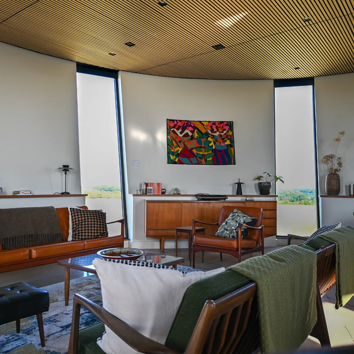 A Circular Living Space At the top of the tower, the former water tank has been completely transformed into an open-plan kitchen, dining, and living space. Measuring around 10 metres in diameter, it comfortably hosts eight for dinner or many more for drinks and gatherings.